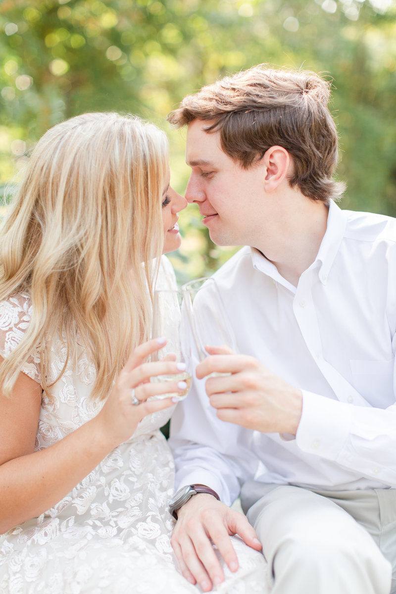 If you’re planning to bring props to your engagement session, we recommend including them only if they’re meaningful to you. Shots of drinking coffee at a local coffee shop would be cute if that’s where you met; however, a trying to fly a kite together when it’s not a part of your relationship may come off as contrived. One of our favorite things to capture is popping the champagne!